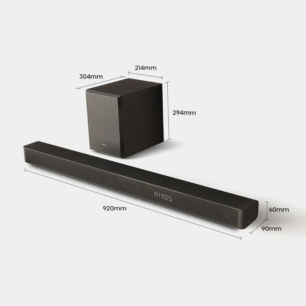 Buy the Hisense 280W Soundbar AX3100G at KSh 19,250. 280W Hisense soundbar with wireless subwoofer, Dolby Digital audio, HDMI ARC, and Bluetooth. The perfect TV audio upgrade for your home cinema in Kenya.